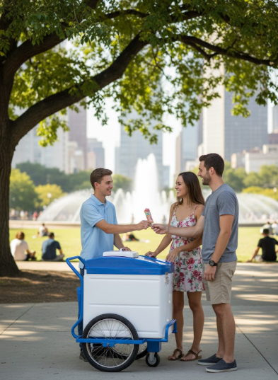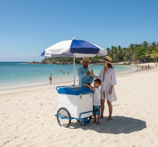 Carro diseñado para la venta ambulante de helados y bebidas frías, con contenedor isotérmico de alta eficiencia térmica y estructura reforzada.